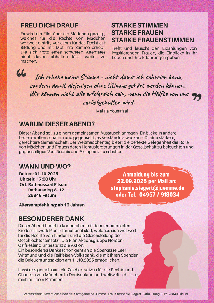 Es werden Postkarten in den unterstützenden Kindergärten und Schulen verteilt. Wenn sich auch andere Einrichtungen daran beteiligen möchten, könnt ihr Kontakt aufnehmen zu Anja Zimmermann, Tel.- 04954 801 207 (auch per Whats App möglich unter dieser Tel-Nr.) oder schreibt eine Mail an gleichstellungsbeauftragte@moormerland.de